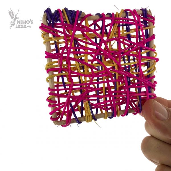 Foot Toy Squares. Rainbow coloured (natural vegetable dye) so they look interesting. These are great entertainment for your bird. Use them dry like a BISCUIT / CRACKER, or WEAVE in greens or treats to really stimulate the MIND and BODY.